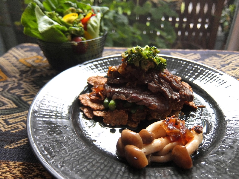 国産牛のカルビ肉は大根おろしをブレンドしたタレに数分漬けてから、テフロン加工のフライパンで両面をミディアムレア程度に焼き、茹でたブロッコリーとシリアルを添えます。サイドメニューはソテーしたキノコとグリーンサラダです。