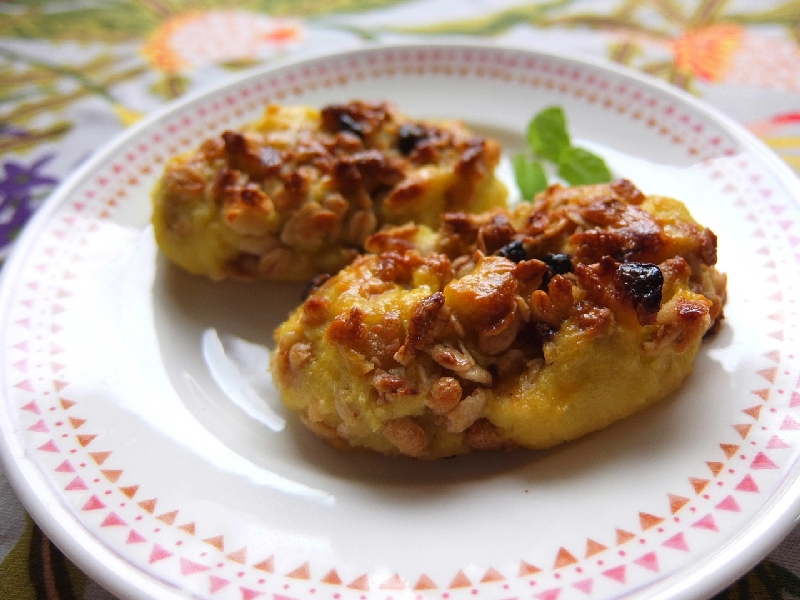 鳴門金時のさつまいもは薄切りにして電子レンジで数分温め、スプーンの背の部分で潰します。さつまいもが潰れてしっとりしたら、バター・砂糖・牛乳を混ぜあわせ形を整えてシリアルをのせます。全体に溶き卵を刷毛で軽く塗り、180度10分で焼き上げます。
